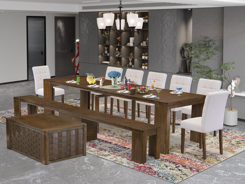 Step into the opulent Luxe world created by East West Furniture, our exclusive high-end furniture brand, and experience its unmatched elegance firsthand. Luxe by East West Furniture introduces a 10-piece dining collection that prioritizes adaptability and functionality, comprising 7 dining chairs, a coffee table, an extendable dining bench, and an expandable dining table. This arrangement provides you with the freedom to customize your seating and table layout according to your exact preferences. The extendable table showcases a captivating Antique Walnut tabletop and legs that seamlessly blend with the Antique Walnut finish of the coffee table, resulting in a cohesive and harmonious aesthetic. The dining chairs offer comfortable seating with Light Gray Faux Leather upholstery, paired with matching Antique Walnut legs, while the bench seats maintain the enduring Antique Walnut finish. Crafted with meticulous precision, this dining set is expertly fashioned from durable Acacia hardwood, ensuring both its longevity and the preservation of its appealing appearance. Elevate your dining area with this modern dining set, featuring sophisticated chairs with premium Faux Leather seats and thoughtfully designed backrests.