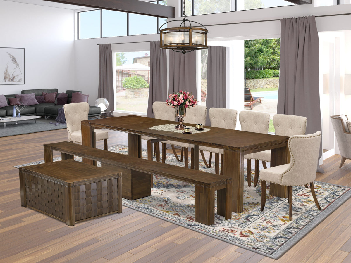 Enter the realm of Luxe by East West Furniture, our exclusive premium furniture brand, and experience its unmatched elegance up close and personal. Luxe by East West Furniture presents a 10-piece dining set that prioritizes adaptability and functionality. This set includes 7 dining chairs, a coffee table, an extendable dining bench, and an expandable dining table, providing you with the flexibility to tailor your seating and table arrangement to your exact preferences. The extendable table features a striking Antique Walnut tabletop and legs that seamlessly harmonize with the Antique Walnut finish of the coffee table, resulting in a harmonious and coordinated aesthetic. The dining chairs offer comfortable seating with Light Tan Linen Fabric upholstery, complemented by matching Antique Walnut legs. The bench seats maintain the timeless Antique Walnut finish. Crafted with meticulous precision, this dining set is expertly constructed from durable Acacia hardwood, ensuring both its longevity and the preservation of its attractive appearance. Elevate your kitchen with this contemporary dining set, showcasing elegant chairs with premium Linen Fabric seats and thoughtfully designed backrests.