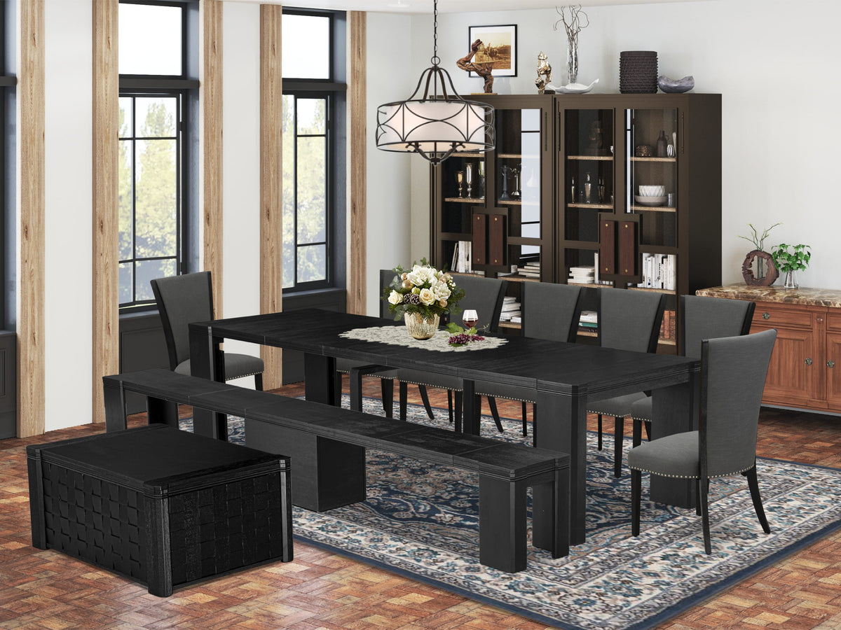 Embrace the exceptional refinement of Luxe by East West Furniture, our high-end furniture brand. Luxe proudly presents a 10-piece Extendable Dining Table Set, featuring a dining table, coffee table, wooden bench, and 7 upholstered dining chairs. These chairs effortlessly blend comfort and style, adorned with a meticulously crafted Wire Brushed Black tabletop and exquisite Dark Gotham Grey Linen Fabric upholstery. The dining bench and coffee table exude opulence with their wire-brushed black finish, while the dining chairs showcase a distinct wire brushed black accent. Crafted from the finest Acacia wood, this set epitomizes strength. The extendable table ensures stability and enduring durability. Modern kitchen chairs with Linen Fabric seats and slatted backs prioritize both comfort and aesthetics. A butterfly leaf table allows for convenient size adjustments. Accessories are organized and packaged, and chair assembly is facilitated by instructions. To savor Luxe by East West Furniture's unparalleled elegance, maintain chair cleanliness.