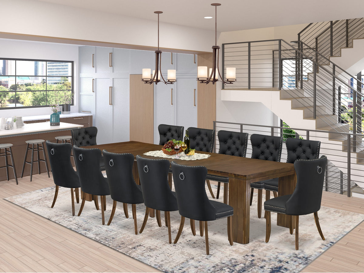 Step into the world of luxury provided by East West Furniture, a renowned brand celebrated for its premium furniture offerings. Luxe by East West Furniture proudly presents an exquisite 13-piece extendable dining set, meticulously crafted to elevate your dining experiences to unprecedented levels of excellence. This exceptional collection comprises 12 dining chairs and an expandable dining table, offering flexible solutions to meet your evolving spatial needs. The expandable table stands as a genuine masterpiece, featuring an Antique Walnut tabletop and legs that exude timeless sophistication and allure. The dining chairs are adorned with Dark Gray Faux Leather upholstery, ensuring not just a comfortable seating experience but also seamless coordination with the Antique Walnut legs, resulting in a harmonious and stylish aesthetic. Every component of this meticulously crafted dining set is expertly constructed from durable Acacia hardwood, guaranteeing both longevity and the preservation of its unique and captivating appearance over time. Our contemporary dining chairs feature high-quality Faux Leather seats, delivering a seamless blend of comfort and style during your dining occasions. With meticulous attention to detail, we have thoughtfully designed the backrests to provide exceptional support, enhancing the overall enjoyment of your dining experiences.