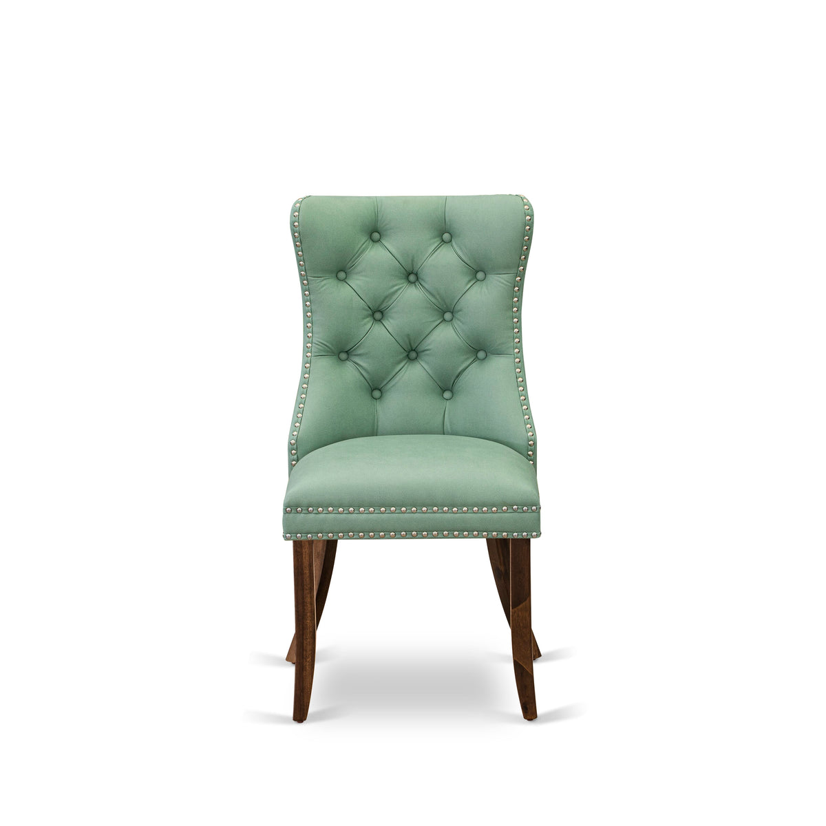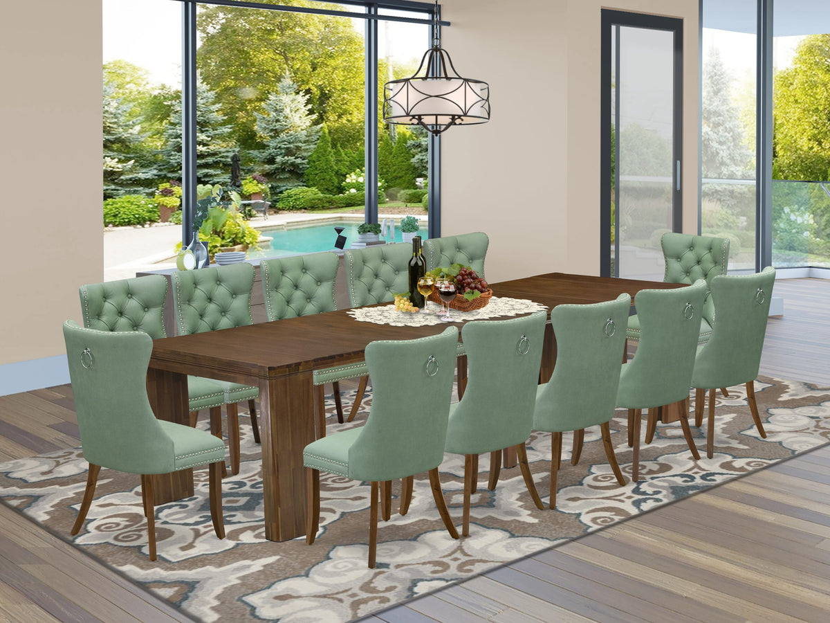 Step into the world of Luxe by East West Furniture, a brand synonymous with exceptional luxury furniture. Luxe by East West Furniture presents a 13-piece extendable dining collection that will transform your dining experience. This exquisite set includes 12 dining chairs and a versatile dining table with expandable capabilities, Revamp your dining area with versatile solutions designed to accommodate your evolving space requirements. The expandable table is a true masterpiece, featuring an Antique Walnut tabletop and legs that exude timeless sophistication and charm. The dining chairs are upholstered in Willow Green Faux Leather, not only providing a comfortable seating experience but also seamlessly matching the Antique Walnut legs, creating a cohesive and stylish look. Every piece of this meticulously crafted dining set is constructed from robust Acacia hardwood, ensuring both durability and preserving its unique and appealing aesthetics over time. Our contemporary dining chairs showcase Faux Leather seats of the highest quality, ensuring a comfortable and stylish dining experience. With careful consideration, we've designed the backrests to provide exceptional support, adding to the overall enjoyment of your meals. Immerse yourself in comfort and elegance with these thoughtfully crafted chairs, making every dining moment special.