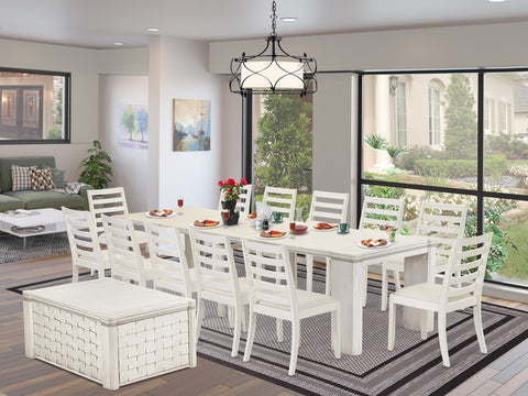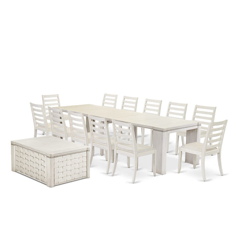 Discover the world of Luxe by East West Furniture, our exclusive premium furniture brand, and immerse yourself in its unparalleled sophistication up close. Luxe by East West Furniture presents a 14-piece dining set, comprising 12 stackable chairs, 1 coffee table, and an expandable dining table. This thoughtfully curated collection showcases incredible adaptability, making it an excellent choice for various settings. The extendable table boasts a stunning Antique White tabletop and legs that beautifully complement the refined Antique White Finish of the coffee table. The dining chairs come upholstered in Cream Linen Fabric, providing both comfort and seamless coordination with the matching Antique White legs, ensuring a consistently stylish look across the entire set. This meticulously crafted extendable dining set is skillfully constructed from robust Acacia hardwood, guaranteeing years of dependable service. The use of resilient Acacia hardwood not only ensures the set's durability but also preserves its distinctive and appealing aesthetics over time. The contemporary dining set includes elegant dining chairs with high-quality Linen Fabric seats. These cushioned chairs feature a carefully designed, stylish backrest that offers exceptional support, ensuring comfortable and extended conversations.