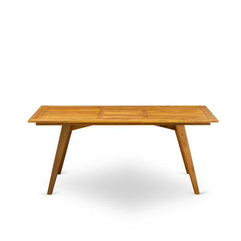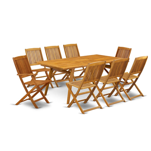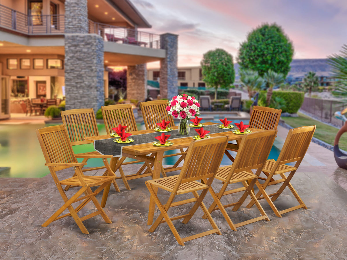 Our outdoor patio set includes 8 remarkable patio dining chairs and an incredible legs rectangle patio table. This wood patio table set style is so good that a reason this patio table set matches any backyard. The amazing modern table set offers a Natural Oil hardwood rectangle patio table and an excellent Natural wooden chairs seat and slatted back that bring beauty to your yard area and boost the elegance of your excellent backyard. The good quality of our amazing foldable outdoor chairs helps our beautiful customers to get relaxation and feel free when getting their meal. This outdoor dining table is produced from high quality rubberwood which can bear the weight of 300 Lbs. This outdoor dining set is comfortable and relaxing because the back and seat of our wood foldable outdoor armchairs are made of premium quality solid wood. East West Furniture is usually created from modern furniture along with simple assembling parts. We try to keep our patio set innovative as well as simple. Our high class patio set is ideal for your beautiful garden area as well as the lawn. You can use it for casual outdoor parties. Keep enjoying East West modern furniture.