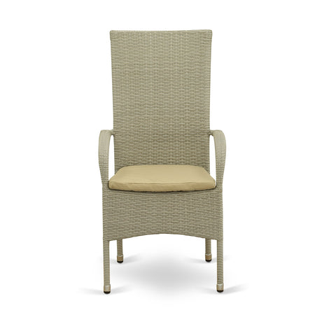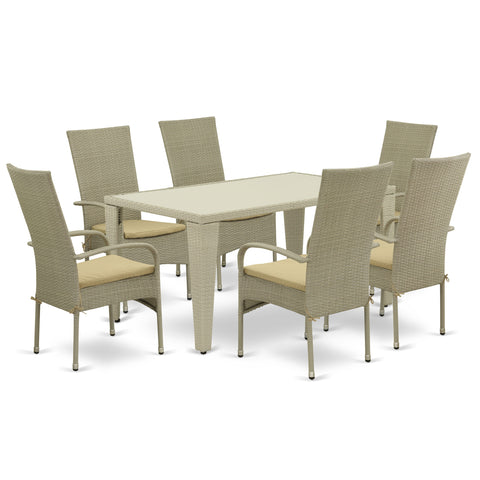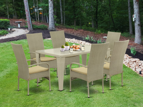 Furnish your patio dining area with this wicker patio set with a Natural finish. This 7 pc GUOS7-WGE Outdoor-Furniture set includes an acacia wood top Outdoor-Furniture table and 6 single arm chairs. Constructed from a lightweight steel frame and wrapped with woven resin wicker fiber, this solid foundation weather-resistant Outdoor-Furniture set functional uses, and maximum comfortability. The all-weather table with acacia wood table top brings a sophisticated look and allows you to place snacks, drinks or decorative items. The matching armchairs with cushions are designed to provide a comfortable and relaxing lounging experience in the Outdoor-Furniture area for hours at a time. The comfortable cushions are water-resistant, dustproof, easy to clean and built to last. Either it’s an intimate gathering or a charming family dinner, this contemporary dining set delivers a great dining time experience in the fresh air with your family or friends.