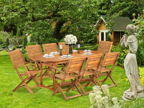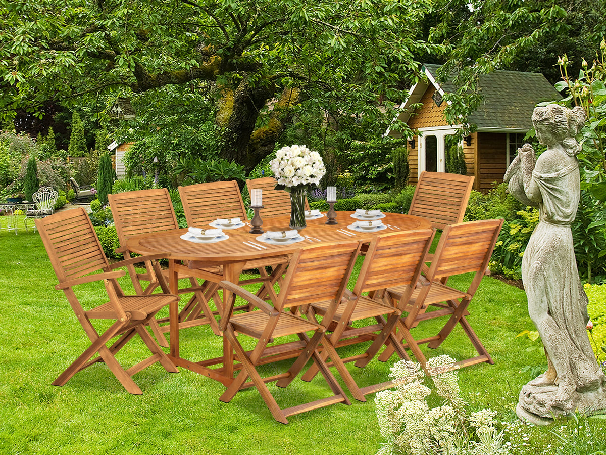 Looking for the perfect patio dining set for your small outdoor gatherings? Look no further than this patio dining set includes a Oval patio dining table with four arm chairs. The set is designed to be both stylish and functional, with a folding feature of the chairs makes it easy to store when not in use. Whether you have a backyard, balcony, or porch, this outdoor patio dining sets will complement any outdoor area. With its natural oil finish, the set creates an inviting, smooth, lustrous seating arrangement that will enhance any outdoor decor style. Plus, the environmentally friendly finish makes it a great choice for eco-conscious shoppers. Constructed from durable Acacia wood, this patio dining set is built to withstand various weather conditions and last for years to come. Another Key feature of this patio dining set is that it is easy to maintain. Restaining the furniture once a year can help to keep it looking brand new and extend its lifespan. The rustic design adds charm to any outdoor space, while the burr-free finish ensures a comfortable dining experience. Assembly is a breeze thanks to the easy-to-follow instructions included in the package. No additional tools are required, so you can have your new patio dining set set up and ready to use in no time. Enjoy the warm weather with family and friends while soaking up the beauty of the great outdoors with this high-quality outdoor patio dining sets.