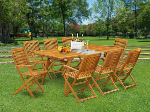 Our table set includes 8 remarkable outdoor dining chairs and an incredible legs rectangle outdoor dining table. This wood table set style is so great that a reason this outdoor table set matches any back garden area. Our stylish outdoor patio set provides a Natural Oil hardwood rectangle modern coffee table and structure and an excellent Natural Oil wooden lawn chairs folding seats and high slatted back that provide beauty to your backyard area and boost the elegance of your excellent yard area. The good quality of our incredible foldable outdoor chairs helps our amazing customers to get relaxation and feel free when getting their meal. This small outdoor table is produced from high quality rubberwood which can bear the weight of 300 Lbs. This table set is comfortable and relaxing as the back and seat of our wood lawn chairs folding are made of premium quality solid wood, East West Furniture is usually created from modern furniture along with simple assembling parts. We try to keep our patio set modern as well as simple. Our high class modern table set is ideal for your beautiful garden area as well as the lawn. You can use it for casual outdoor parties. Keep enjoying East West modern furniture.