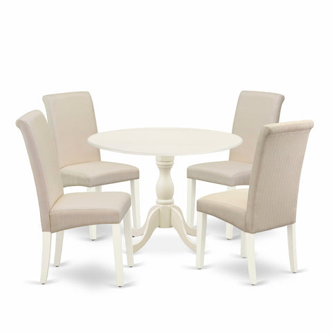 DMBA5-F1V-QW Ensemble 5-Piece Round Dining Set with Dropleaf Table & 4 Cream Upholstered Chairs, White