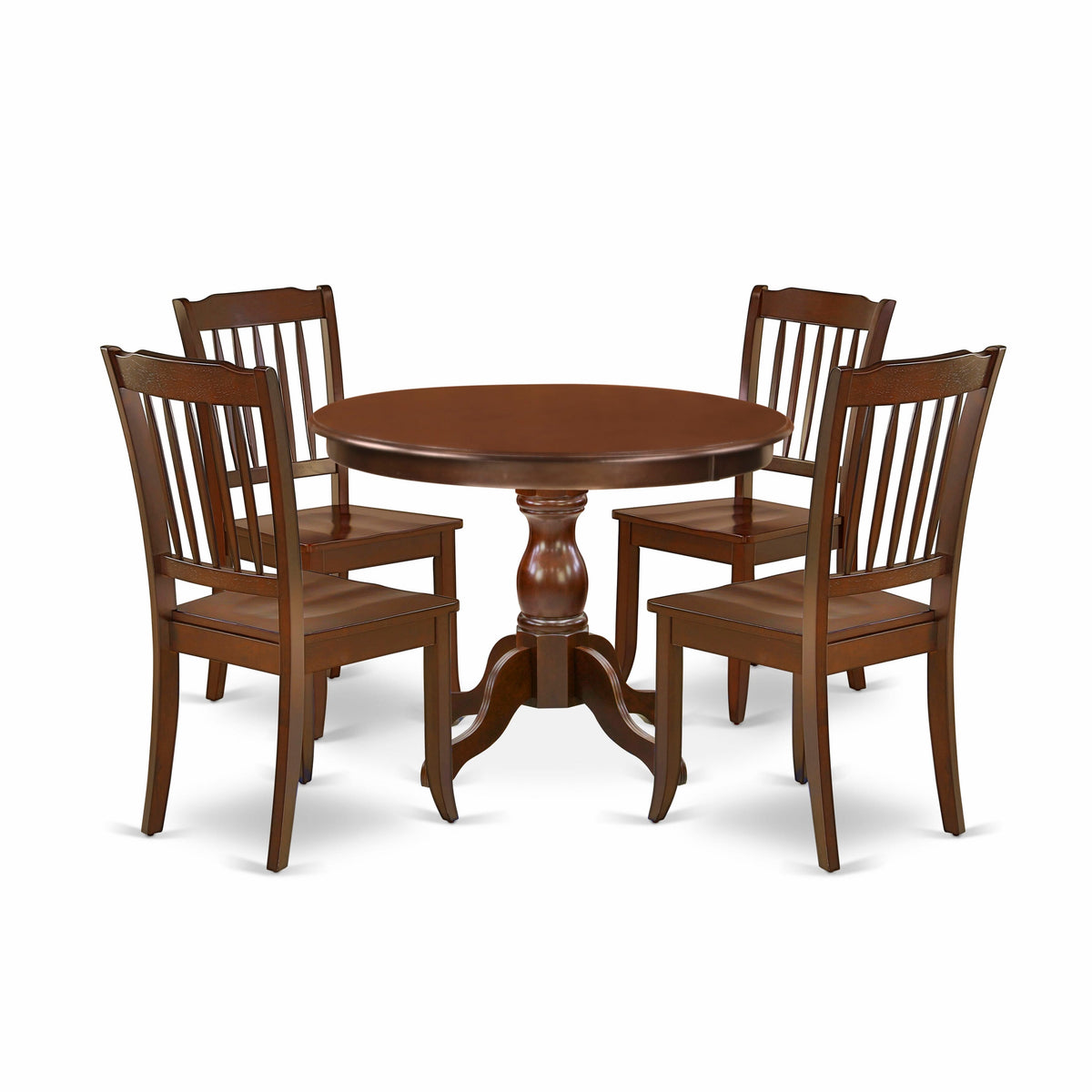 Our 5-Piece table set offers a round modern dining table and 4 kitchen chairs which can fully accommodate your family. The modern dining table set features a sophisticated and eye catching appearance. This classy design and Rustic, Mahogany dining room chairs are perfect to match any dining room. Upgrade your interior decor with our rustic style dining room set. Mahogany textured finish adds a unique allure to any dining room while the wooden legs of both wooden dining chairs and kitchen table will certainly help you to enhance the solidness and traditional feel. The modern style kitchen dining table set adds a touch of elegance to the home that you and your family will absolutely enjoy. Our dining room chairs can bring you a fantastic relaxing experience because it has slatted back and cone-shaped legs. Having a smooth surface, this dining table set for 4 is easy to clean by using a wipe down to get hassle-free maintenance. Assembly of our modern dining table set requires a short amount of time and it will be easy to assemble if you will follow the step-by-step instructions.