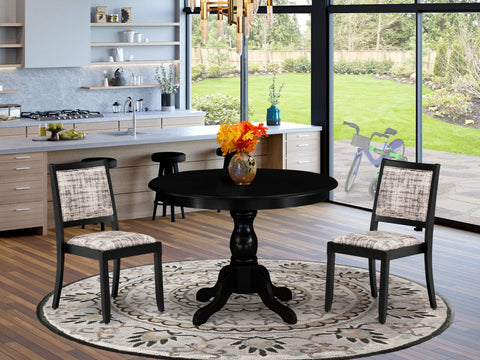 Our 3-piece dining set comprises a round table and 2 stackable chairs, perfect for various occasions and settings. These chairs are designed for convenient storage and space-saving advantages. Both the dining table and chairs boast an elegant and refined aesthetic. The table flaunts a coordinated Wire Brushed Black design on the tabletop and legs, echoed by the stackable chairs in the same Wire Brushed Black finish. These chairs come with comfortable seats upholstered in White & Grey Pattern Faux Leather, enhancing both style and comfort in your dining area. Meticulously crafted, our dining set pays meticulous attention to detail, featuring a durable Rubberwood table and sturdy Rubberwood chairs. These chairs, crafted from incredibly resilient Rubberwood, ensure that your dining set retains its stylish and sturdy allure for years to come, embodying both elegance and lasting quality. Furthermore, our chairs boast high-quality Faux Leather seats that elevate their sophistication and overall appearance. This material offers extended comfort and breathability during extended use, ensuring a delightful seating experience. The classic Padded back design adds a touch of timeless elegance to these chairs, while their durability and minimal maintenance requirements make them a practical choice for long-term functionality, further enhancing their overall appeal.