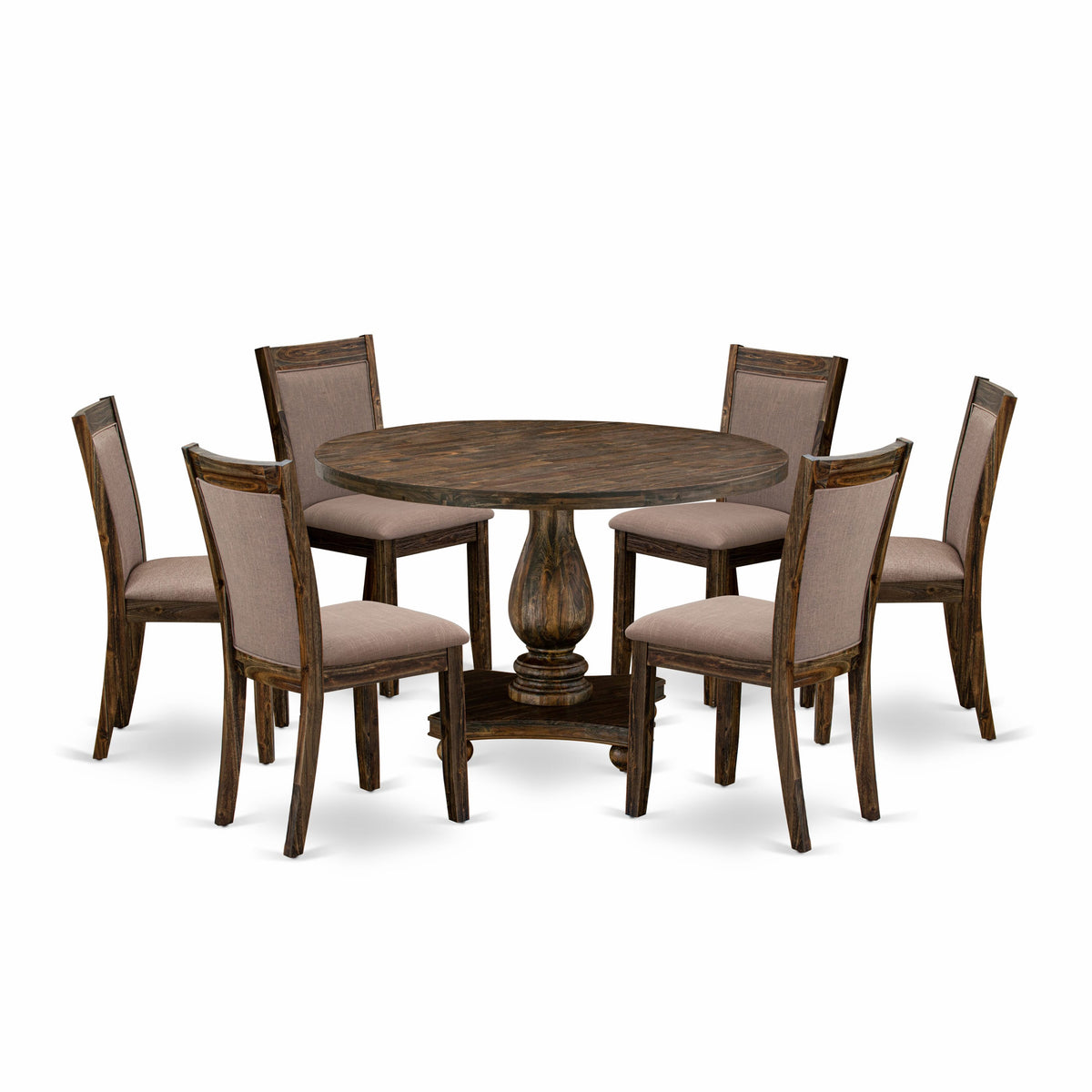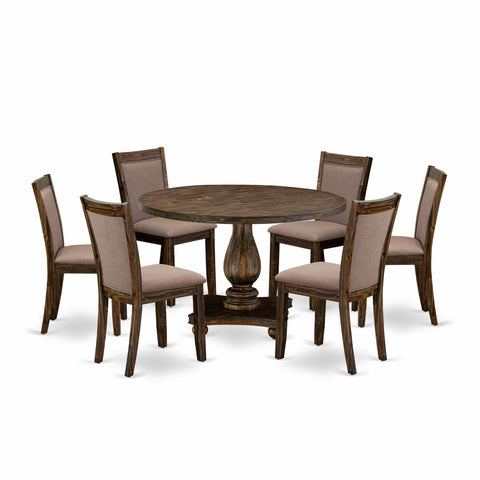 This 7-Pc modern dining set offers a wood table and 6 dining chairs for the dining room which can fully accommodate your family. Asian wood material modern dining set is sturdy and durable. The set of 6 parson chairs in linen fabric foam padded seat will not feel tired even after a long time sitting. The seat and back cushion is made of high-quality material of linen fabric for the backrest because of the upholstered back. This attractive dining room set with a solid wood frame will enhance the appeal of any dining area. Upgrade your home decor with our modern style kitchen round dining table set. The Distressed Jacobean finish adds a unique attraction to any kitchen room while the wooden legs of both upholstered chairs and wooden table will surely help you to enhance the solidness and classic feel. The classy design in the premium finish is ideal to match any dining room. Change your interior decor with our antique design kitchen round dining table set. The dining room set adds a touch of magnificence to the kitchen that you and your family will surely enjoy. The smooth surface table set is easy to clean with a damp cloth to get hassle-free maintenance. Assembly needs not much time and will be easy to assemble if you will follow the step-by-step instructions of the manual.