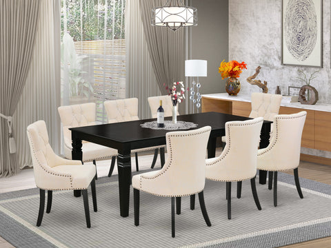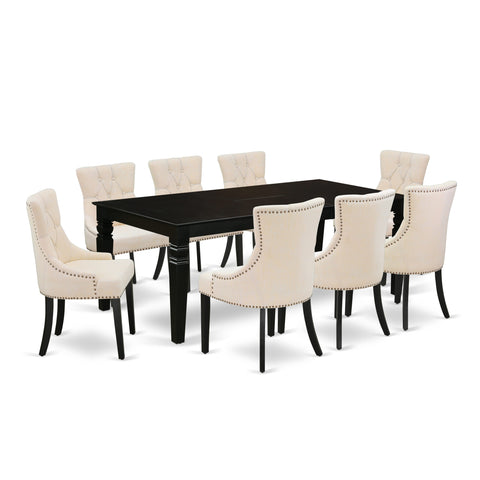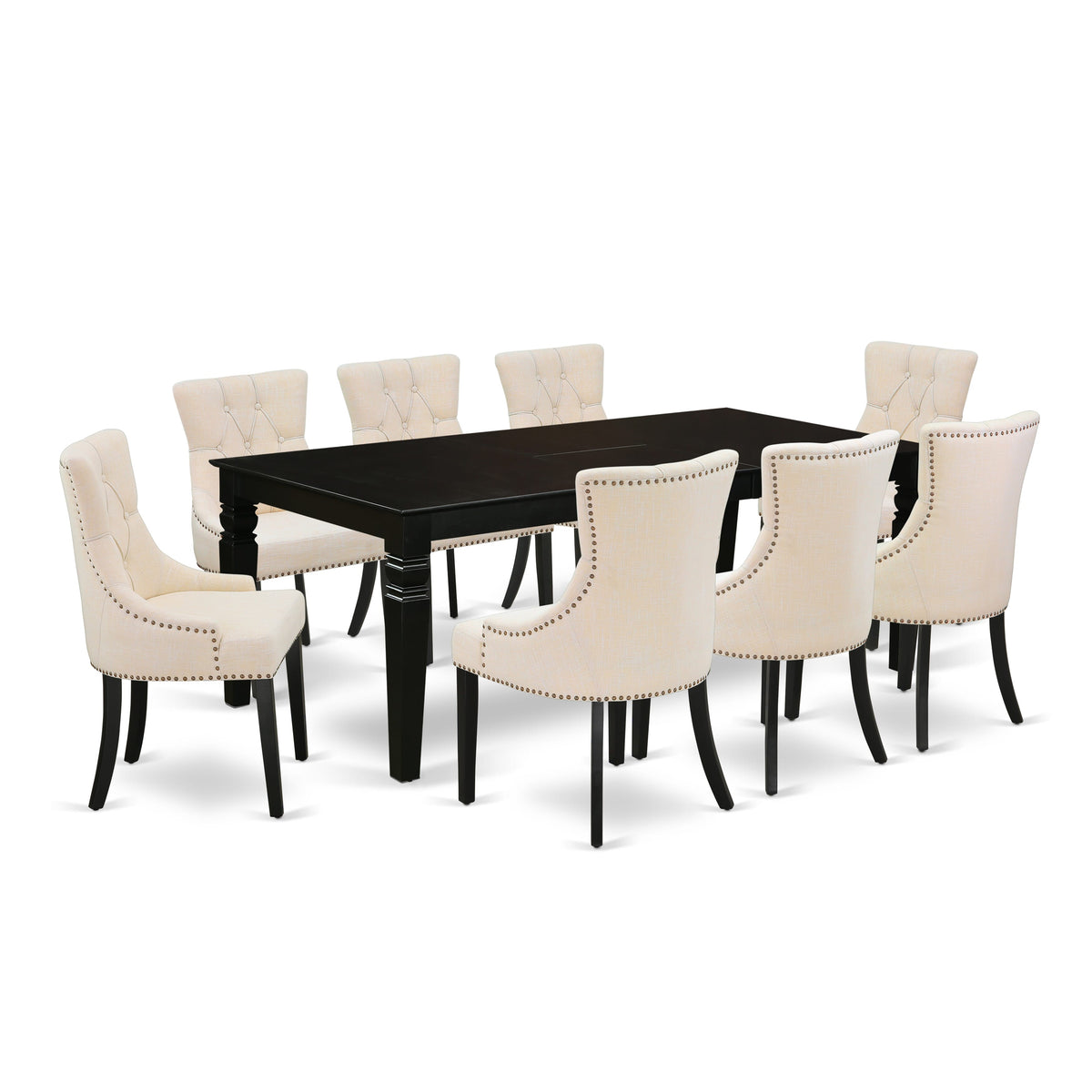 Spice up your dining area with this LGFR9-IN0-CY grand dining set includes a timeless missionary design large dinette table and eight parson chairs. A contemporary twist on a classic design, the eye appealing design of this dining set liven up your dining space. This rectangular sturdy wooden table based on 4 straight legs with carved design has plenty of space for 4-8 people to sit and enjoy their meal comfortably. The dining table integrates an 18 inch self-storage extension leaf which can be stored right beneath the table top. This wonderful kitchen table makes a really great addition for all kitchen space and corresponds all sorts of dining-room concepts. A regal and affordable Parson chair offers a touch of beauty to any dining room and provides a sensible seating arrangements. The upholstered parson chair features a beautiful stitched exterior. Tall back, Linen Fabric, high-density foam padding, solid hardwood frame construction, comfortable, durable and attractive. Whether you use this dining chair is an easy to assemble and stylish answer to your seating needs. The standard shape, size and design makes the dining area significantly attractive. This contemporary, budget friendly, durable and comfortable dining set can be good choice if you are looking for a great dining time experience with your family or friends.