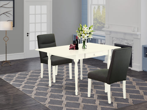 Upgrade your dining area using this simple yet versatile MZBE3-IGN-FV dining set. This exclusive dining table set for 2 offers a stylish appearance to enhance any kind of dining room or home's dining space for any gatherings. The convenient 3 pieces dinette set contains a rectangle table and two parson chairs. The rectangle-shaped wooden table finished in linen white is made from top-rated quality rubberwood known as Asian hardwood. The kitchen table integrates two 9-inch drop down leaves that provides additional space for extra food trays and drinks. The 2 drawers of the dining table provide additional storage to help keep you organized. The easy to assemble kitchen table ensures comfort and long-lasting use. These standard height parson chairs offer luxurious seating as well as stylish design. Complete in a Linen White finish, these parson chairs feature a padded, foam-filled interior with tightly wrapped fabric upholstery. The frames are made of high-quality wood that makes the chairs very durable and stable. The upholstered dining chairs is engineered to offer a great amount of comfort to your spine and thus reduce the chances of back pain. The conventional parson gives this chair a touch of familiar charm, while the linen fabric in Dark Gotham Grey color and clean-lined design elevate this parson dining chairs with a modern flair. This contemporary, budget-friendly, durable and comfortable kitchen set can be a good choice if you are looking for a great dining time experience with family and friends.