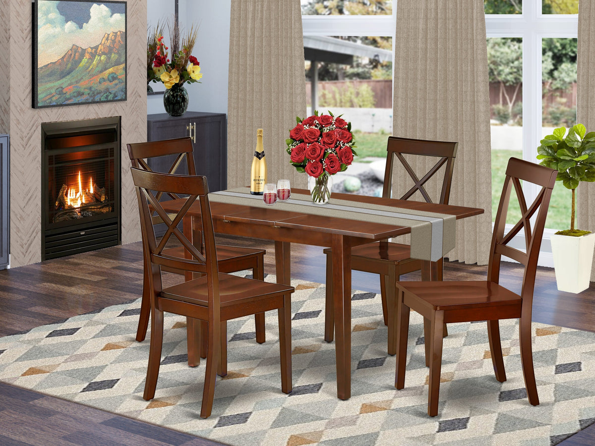 This superb dining set features a Mahogany color that enhances a number of various attractive themes. The smooth color of this kitchen table subtly demonstrates light to brighten up the living area and showcase the dining room tables, kitchen dining Chairs. The extendable leaf can be easily expanded making dining space for personal occasions or great parties. A single bevel edge and a rounded finish provide this dining room table fits into small kitchen space, Great for compact apartments. No heat treated pressured wood like MDF, particle board or veneer top was fabricated. Slender x back Dinette chairs present trendy and comfy Seating, with wood seats finished in a smooth Mahogany color which let you enjoy a nice and trendy dining experience. Made up of hardwood, the wooden chair is stable and offers a sturdy finish. The dining chairs add elegance and class to any place you have placed them. The frame of the dining chairs are engineered to offer a great amount of comfort to your spine and thus reduce the chances of back pain. The matching color of the chair with the table brings a good contrast in the kitchen area. The standard shape, size and design make the dining area significantly attractive. This contemporary, budget friendly, Durable and comfortable dining set can be a good choice if you are looking for a great dining time experience with family and friends.