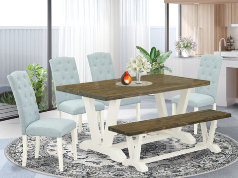 This 6-pc kitchen dining room set consists of 4 upholstered dining chairs, 1 modern dining room table and a small bench. These kitchen chairs have a Linen Fabric seat, Button Tufted Chair Back, and the kitchen dining table includes a rectangular top and Wooden Legs. The upholstered dining chairs seat and the chair back are made of Linen Fabric in a Baby Blue color upholstered dining chairs hardwood structure and the Linen Fabric seat is simple to clean. You can clean dirt quite simply and often save time by using a damp cloth. This dining chair and the modern dining room table are a great choices for your dining room or kitchen. The easy frame of the kitchen chairs and the kitchen dining table as well as screws of the same size allow a simple and fast build.