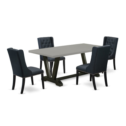 This sophisticated 5-Piece dining room table set is going to make your family mealtime more comfortable and pleasant! Our 5 Piece dinette set includes 4 dining chairs and a wood table. The Button Tufted-Back chairs are slightly and elegantly curved, expertly finished with Linen Fabric soft upholstery. Our parson chair seat is created from Linen Fabric that offers a great sitting experience. This dining table has a rectangular Cement tabletop and Wire brushed Black V-Style Legs. These nailhead dining chairs have Black Linen Fabric and Wire Brushed Black hardwood chair legs. These parson chairs stand on a sturdy hardwood frame with solid legs and a contemporary Wire Brushed Black finish. Designed with easy and fast assembly in mind, each set comes conveniently flat packed with easy to follow instructions and all necessary tools included. This contemporary, budget-friendly, durable and comfortable dining room set furniture can be a great choice for you and your family if you enjoy the dining experience. Enjoy with East West Furniture!