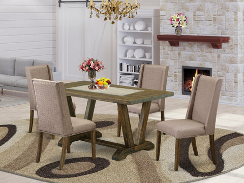 This dining room set includes 4 gorgeous Kitchen Parson Chairs and a beautiful dining table. This rectangular dining table is offered in an elegant Distressed Jacobean finish. In addition, the Parson Chairs in a Dark Khaki linen fabric enhance the elegance of any kitchen or dining room. Our kitchen set provides great durability because this wood table is built from high quality Asian Wood which can bear the weight of 300 Lbs. We have created these Modern dining chairs and dining table with the help of highly experienced carpenters, who generate a smooth and high-end finish to this dinette set. We try to offer innovative as well as easy to assemble products. Our high-quality kitchen set is perfect for you and your beautiful dining room as well as the kitchen area. You can use it for casual home parties or intimated gatherings. Keep enjoying East West modern furniture!