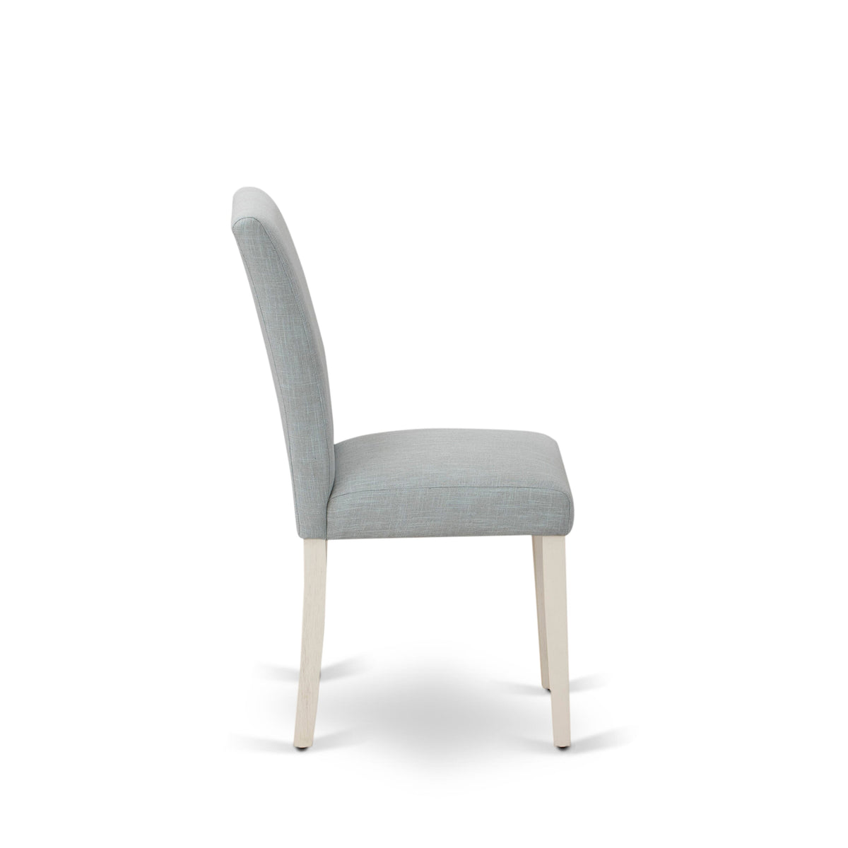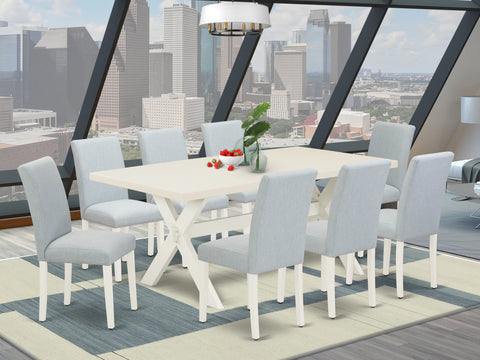 This dining room set includes 8 modern chairs and a wooden dining table. This rectangular table has a rectangular top and beautiful X legs. The dining chairs have linen fabric seat and a stylish high back. The seat of our modern chairs provides a good sitting experience and a stylish high back to fit your Back Correctly for the backrest. Upholstered chairs in this dining room consist of legs. The color of the seat of the dining chair is Baby Blue and the wooden legs are Wire brushed Off-White. The top color of the dinner table is Off-White and the wooden X legs are Wire brushed Off-White. The Kitchen Dining Room Chairs are made of solid wood. This wood is also called rubber wood. This wood always gives durability and strength. This breakfast table and modern chairs give more balance with the help of legs because this is made of rubber wood. Make your completely dining room set stronger. You can use this dining room table set for a long time. You can move our modern chairs under the wood dining table when you finish your meal. Easy to assemble these mid-century modern chairs and kitchen table. You only need to take about 50-60 minutes to assemble each dining room set. This kitchen table set comes with all the necessary tools. This dining table set clean easily because this dinette set design has smooth. You can easily clean this set with any brush and dust cleaner cloth. You can clean this dining table and kitchen chairs within a few minutes. This dining table and kitchen chairs are matched with any room décor because of their style. This dining table set offers an always-fresh look and attracts any person who comes to your home.