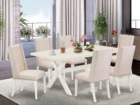 Take your kitchen or dining area to the next level with our modern style kitchen set. Consists of 6 stylish back kitchen chairs with slightly curved angles throughout, in a bright colored finish. The kitchen table features a traditional design with painted, fresh Off-White finish legs for a simple, yet an elegant table. Enjoy meals with your family, with this classy rectangular dining table set. The chair is covered with breathable Linen Fabric to produce a comfy touch. High Back Kitchen Parson Chair with copper nails around looks noble and elegant. This listing has a premium color of Off-White finish for the dining room table top and Cream Color Finish Parson Chair of Stylish back. Our fantastic premium colors boost the elegance of your dining area and provide a magnificent glance to your dining room or kitchen area. East West Furniture is always created from modern furniture along with easy assembling parts. We try to keep our furniture parts modern as well as simple. Our high class dinette set is perfect for your lovely dining room as well as the kitchen. Our dining room set is the perfect complement to your home! Deliver your guests the best seat in the house. Enjoy with East west Furniture!