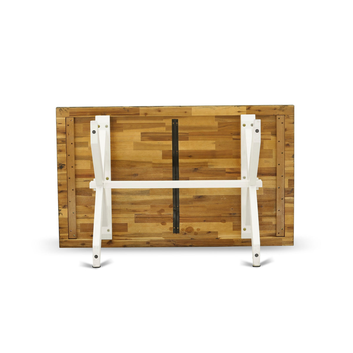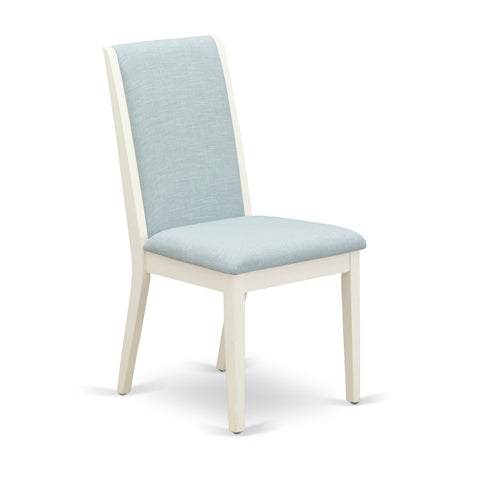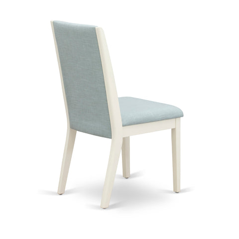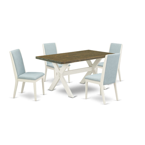 Introducing East West furniture's innovative home furniture set which can convert your house into a home. This special and cutting edge dining set contains a dining table combined with Parsons Chairs. Splendid wood texture with Wire brushed Linen White and Distressed Jacobean color and a cross leg design describe the stability and sustainability of the kitchen table. The perfect dimensions of this dining table set made it quite simple to carry, clean, assemble and modify its places. The base is constructed from sturdy hardwood Acacia, the kitchen table can be assembled without any extra tools and made to last for a long. These Lancy high back side chairs offer luxurious seating as well as stylish design. Complete in a Wire brushed Linen White finish, these chairs feature a padded, foam-filled interior with tightly wrapped Baby Blue color fabric upholstery. The frames are made of high-quality wood that makes the chairs very durable and stable. Plush padding covered with a soft fabric seat offers comfort and the standard height back provides support for relaxing seating. The dinette chairs are engineered to offer a great amount of comfort to your spine and thus reduce the chances of back pain. The standard shape, size and design make these dining chairs significantly attractive. This contemporary, budget-friendly, durable and comfortable dining set furniture can be a good choice if you are looking for a great dining time experience with family and friends.